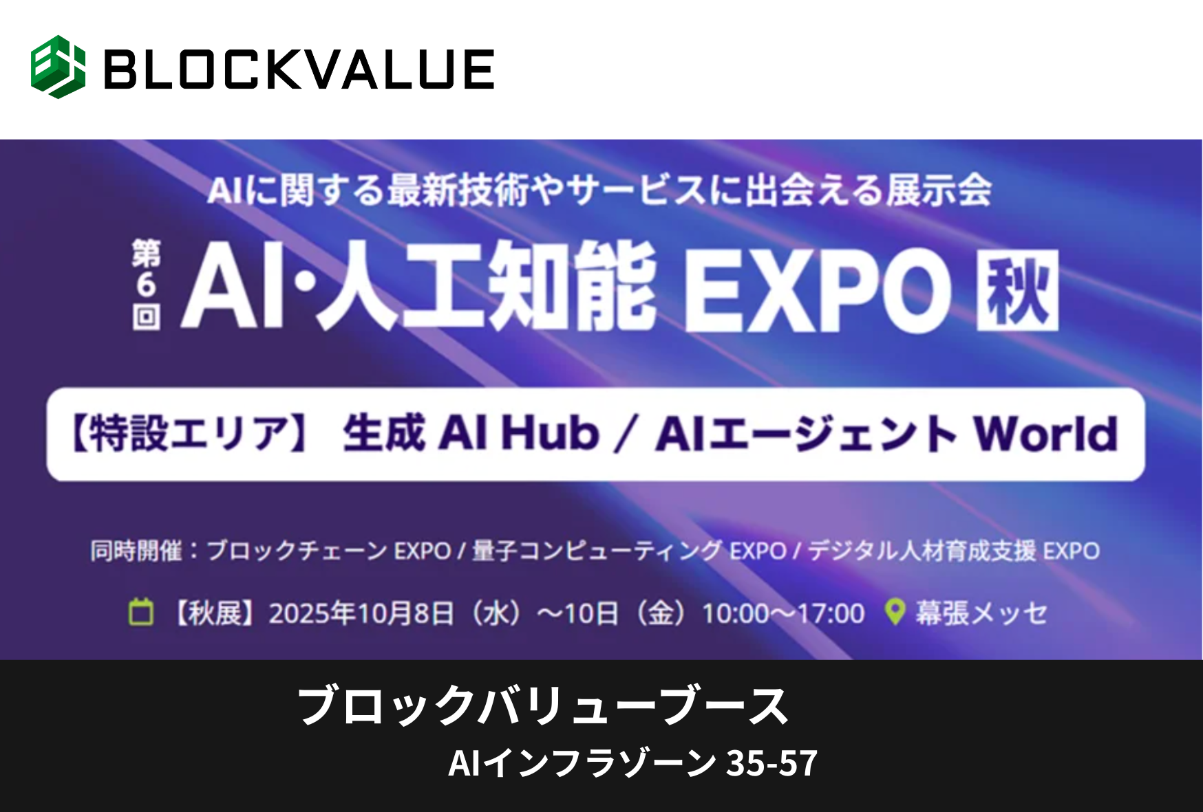 株式会社ブロックバリューは、2025年10月8日(水) – 10日(金)に幕張メッセで開催される「NexTech Week 2025[秋]/AI・人工知能EXPO」に出展しいたします。